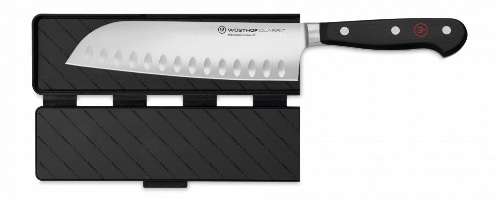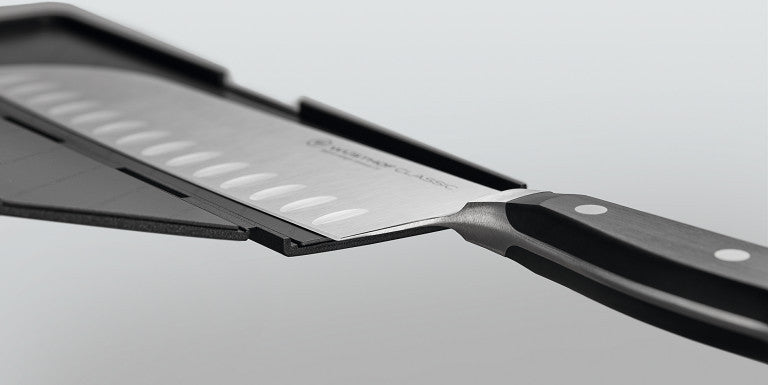 The magnetic Wüsthof blade guard ensures safe storage of knives, protecting them from scratches and damage. This hinged blade guard is easy to open and magnetic, allowing for secure closure.