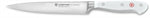The Wüsthof Classic knife series with white handles adds a special touch to the kitchen. With sophisticated simplicity and stunning elegance, these timeless knives offer everything you need to prepare and serve fresh dishes. They are perfectly balanced, comfortable to hold, and easy to control, while preparing ingredients for any dish. Robust, sharp and functional - the classic kitchen tool series that stands out for its ease of use and is the right tool for every home cook and professional. Blade forged from a single piece of stainless steel (X50CrMoV15) with a hardness of 58 HRC. This special, high-carbon, corrosion-resistant alloy ensures that the critical properties of every Wüsthof knife are retained from the start: razor-sharp, long-lasting cutting edge, high rust resistance, easy to restore edge. They are made in 55 sophisticated production steps: from forging to hardening and sharpening to polishing, and every perfectly manufactured Classic knife undergoes more than 20 uncompromising quality control points. Particularly sharp thanks to the Precision Edge Technology (PEtec) laser-controlled sharpening process. The hand-finished finish by experienced Wüsthof craftsmen ensures exceptional sharpness, fast and easy cutting. They have grip panels made of a comfortable and durable synthetic material, polyoxymethylene (POM) - which has a more compact molecular structure to resist fading and discoloration. The full-length bakni protects the hand, ensuring safety and balanced weight distribution. The robust grip panels are triple riveted for durability. Wüsthof technology offers outstanding sharpness: extremely high initial cutting performance, exceptionally long edge retention, long blade life, optimal cutting edge along the entire length of the blade, unique, consistently high and reproducible quality. It is made entirely in Solingen, Germany. The Wüsthof Classic series is certified by the NSF (National Sanitation Foundation) for public health and food safety.