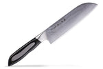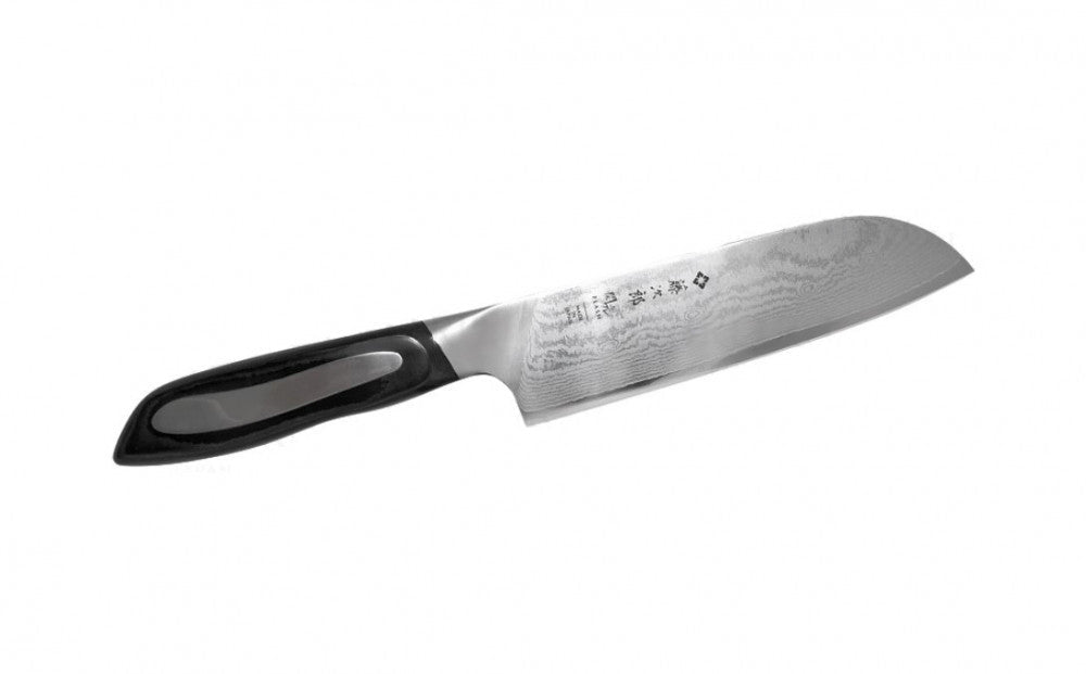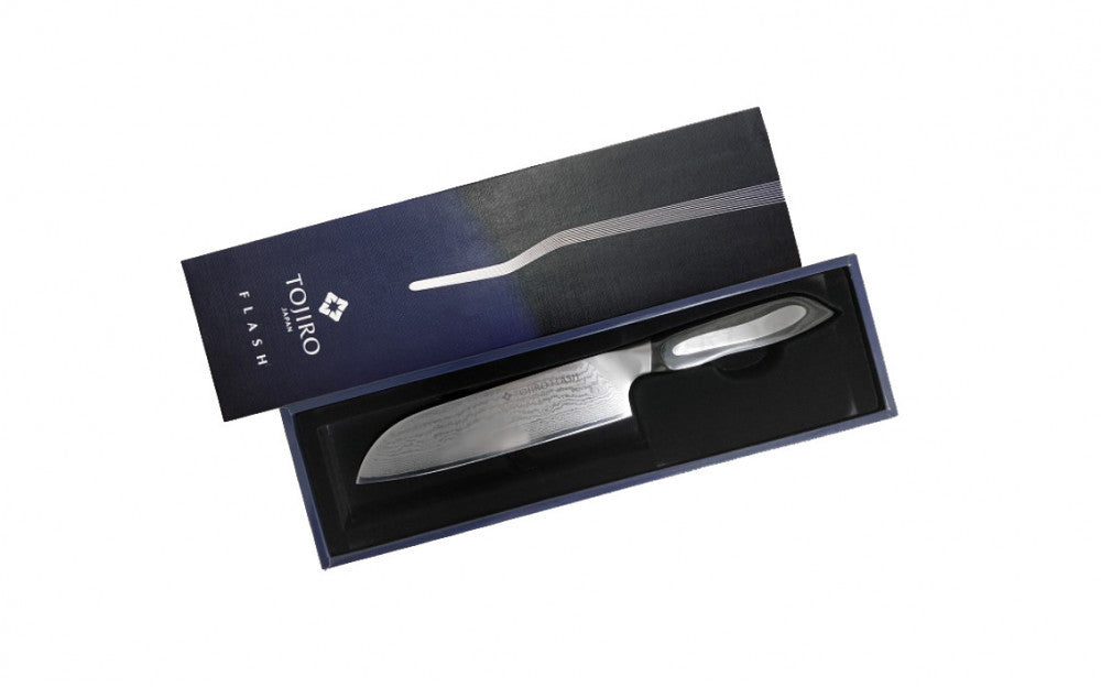 Tojiro Flash DP Damascus Santoku with 18 cm long Damascus steel blade, laminated handle.