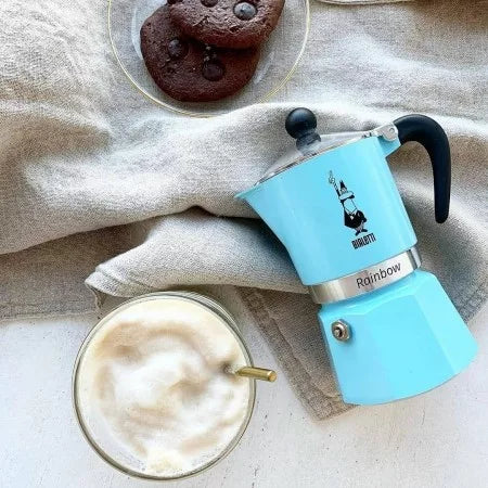 Start your morning with a lively pop of color and authentic flavor. The 3-cup Bialetti Rainbow in a dreamy light blue (Azzurra) finish is designed to make your daily coffee breaks a fun, visually stunning experience. Producing up to 130 ml of rich, full-bodied coffee, this vibrant stovetop coffee maker is the ideal size for a generous single serving or for sharing a quick brew with a partner. Within mere minutes, you can craft a flawlessly intense espresso-style drink right at home.
