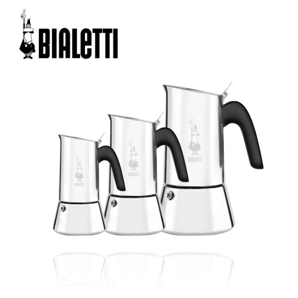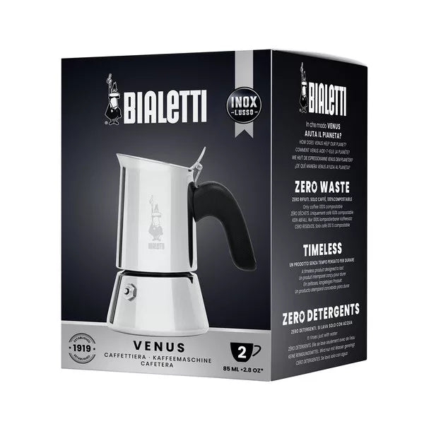 Prepare delicious, full-bodied Italian-style coffee in just minutes with the 2-cup Bialetti Venus. Boasting a sleek, streamlined profile, this elegant stovetop coffee maker yields approximately 85 ml of rich, highly aromatic brew. It is the perfect size for a single, generous morning espresso or for sharing a quick, refined coffee moment with a partner.