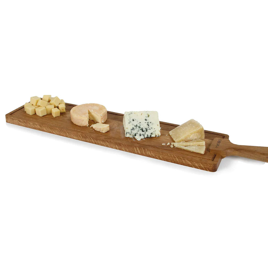 This elongated cheese board is crafted from durable European oak wood, offering an authentic and elegant look. Thanks to the sturdy handle and leather cord, you can easily hang the board after use, making it a decorative centerpiece in your kitchen.