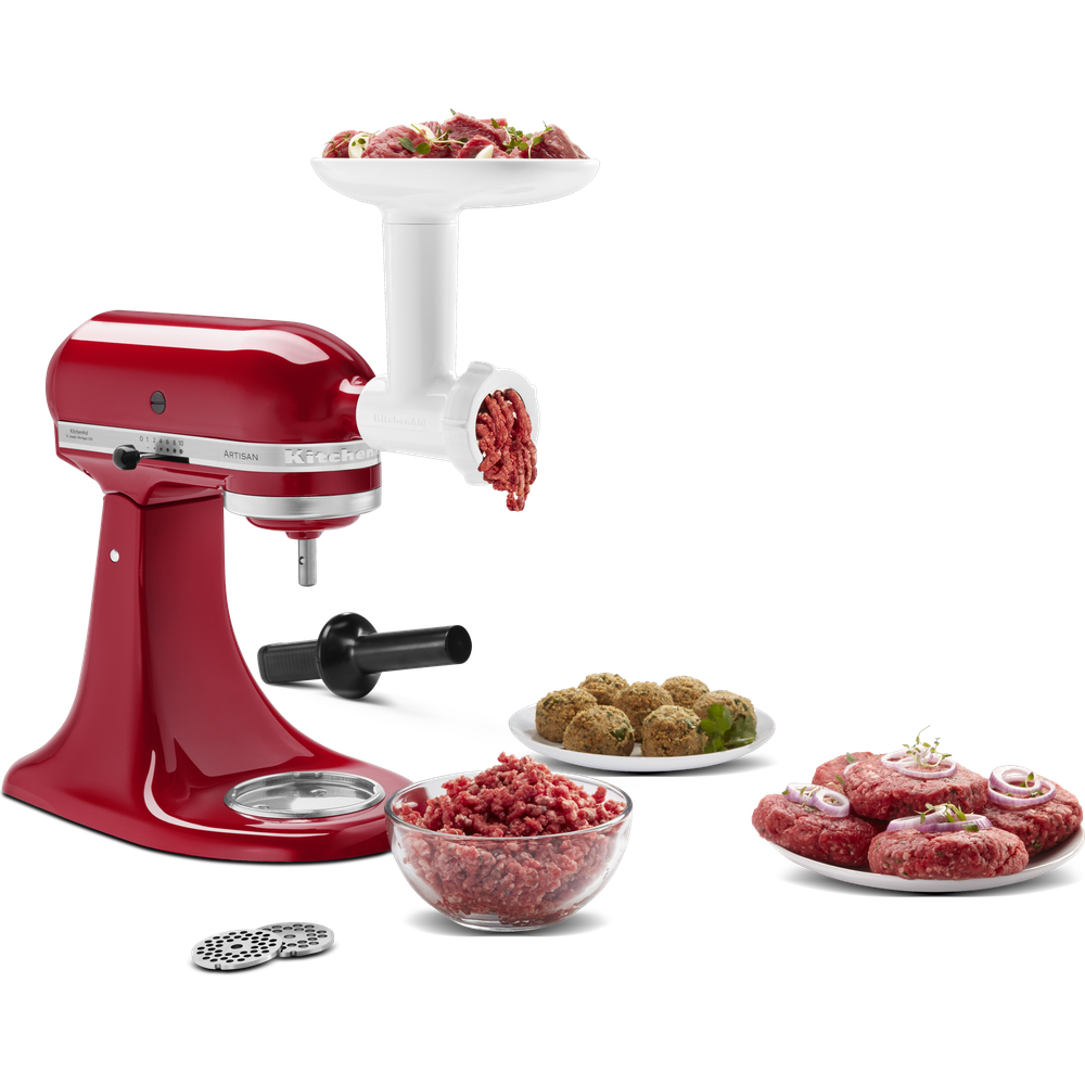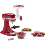 How does it work? Assemble the KitchenAid meat grinder and plug it into the multipurpose attachment hub of any KitchenAid stand mixer (sold separately). Then, turn the mixer to speed 4 and start pushing the food in with the pusher. You’ll get a quality grind of everything from vegetables to raw meat to fruit, nuts, fish and even bread. Throw it in and watch the perfectly minced ingredients emerge. You’ll soon become an expert. TIP: For the best results, meats should be extremely cold, even partially frozen.
