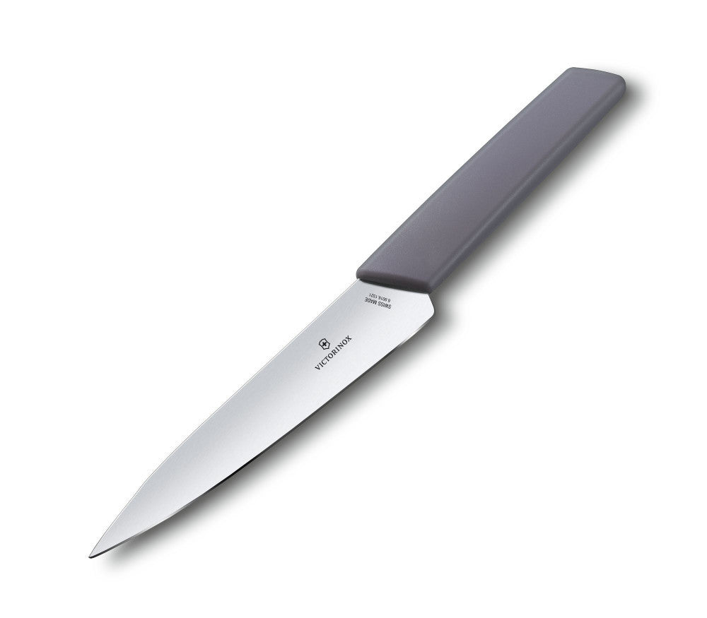 Sleek kitchen knife with synthetic handle. This compact, traditional kitchen helper cuts ingredients with ease. With its slim, precisely pointed blade, the 15 cm Swiss Modern household knife is well suited for meticulous tasks such as peeling, stemming or core removal. For this, the brand new Swiss Modern collection has a super slim, fashionable synthetic handle instead of the traditional walnut. It is easy to clean and can be put in the dishwasher for daily use.